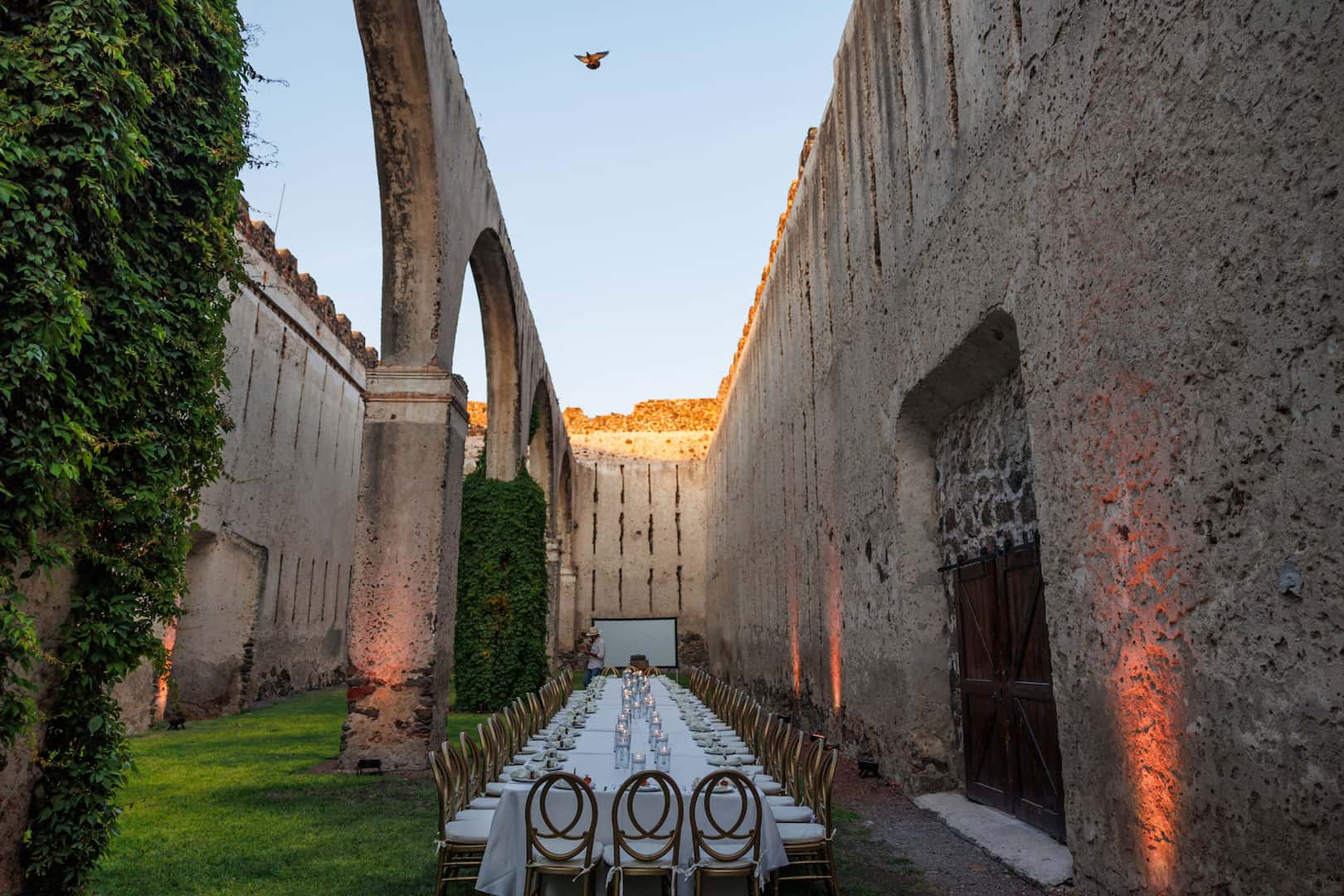 Comienza la experiencia con una reunión íntima para tus invitados más cercanos. Imagina una cena temática bajo las estrellas entre jardines iluminados, incluida para quienes se hospedan en la hacienda y con costo adicional para invitados externos.